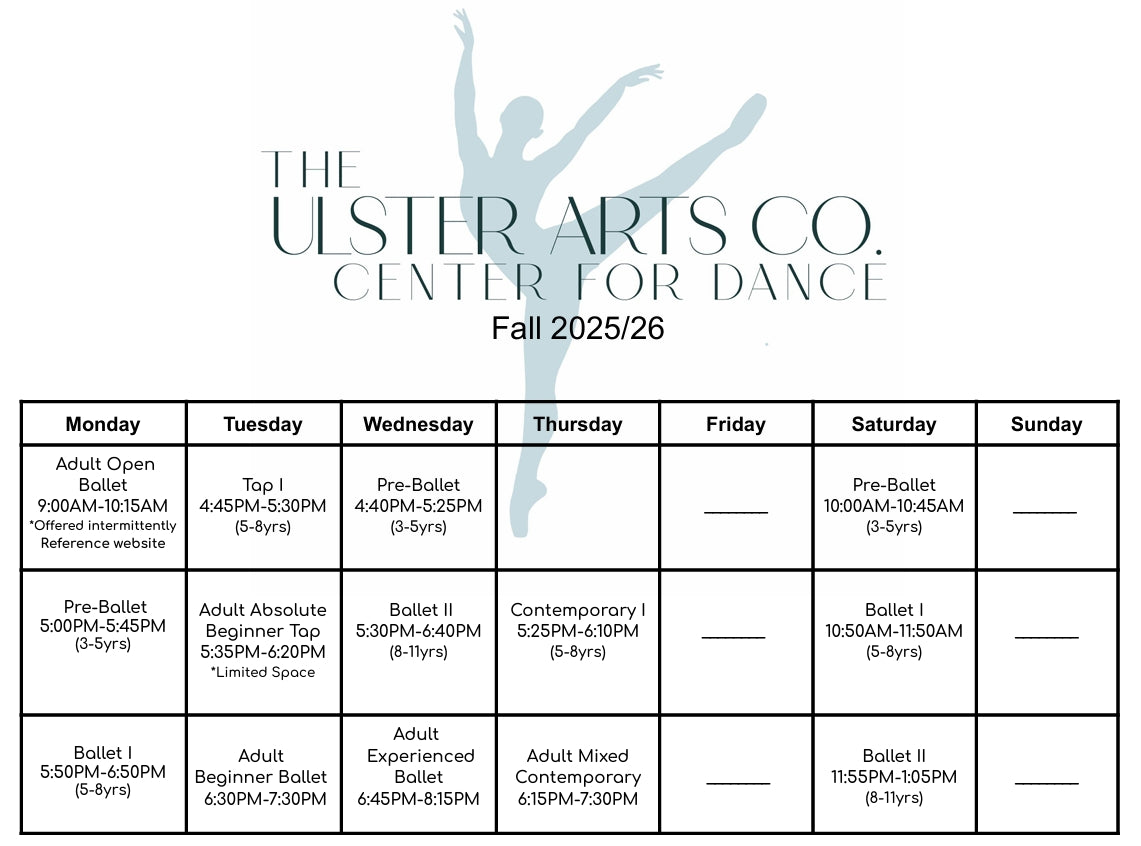 Sign up for our 2025/26 Fall Season! Our twenty-week student program offers a fun, developmentally appropriate, and supportive environment to learn. We specialize in working with young children and growing a passion for dance and movement. Below you will find our weekly schedule, yearly calendar, and upcoming shows for our Center for Dance.